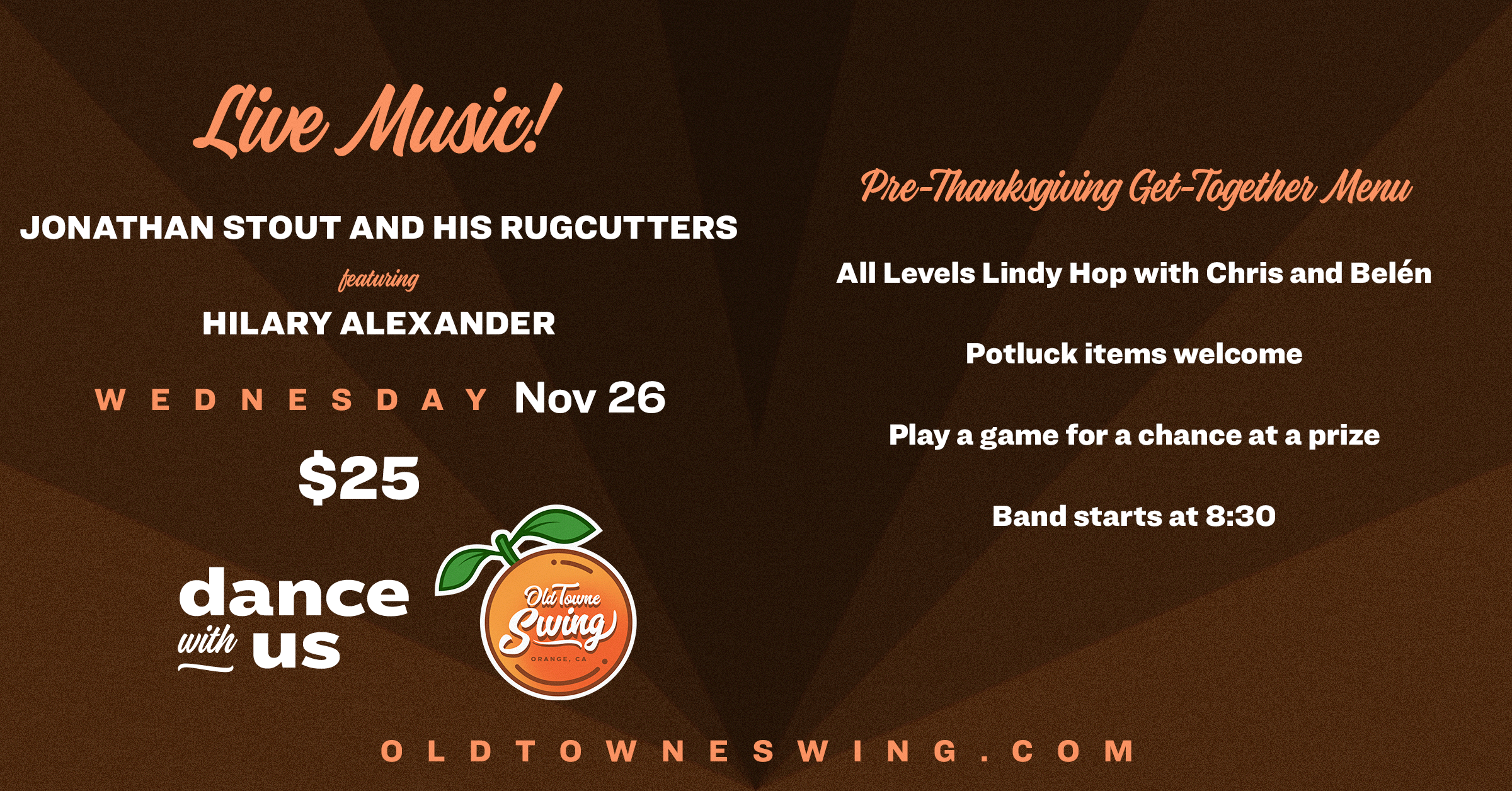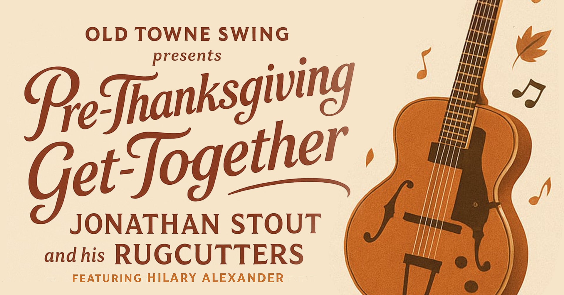 Old Towne Swing is the place to be on the night before Thanksgiving! Our musical guests for this year are Jonathan Stout and his Rugcutters, featuring Hilary Alexander! The Rugcutters are an expanded version of the world famous Campus Five lineup, adding 2 horn players for a total of 4. This special lineup is usually reserved for a few appearances a year at full weekend events, so don’t miss this rare chance to check them out!